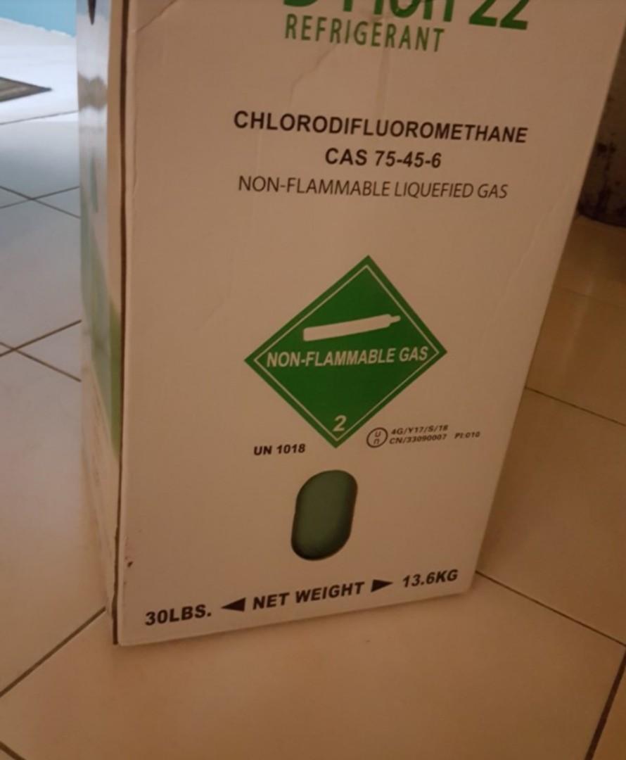 Gas aircond R32 warna putih. Popular digunakan utk aircond rumah ofis masjid dan bangunan. R22 Sehingga sekarang masih digunakan dan sangat tahan sejak inverter wujud jenis ini dipanggil non-inverter.